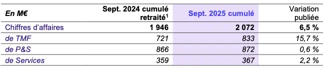 Au 30 septembre 2025, Econocom a enregistré un chiffre d’affaires de 2 072 millions d’euros depuis le début de l’exercice, en hausse de 6,5% en données publiées et de 5,1% en organique, comparé au chiffre d’affaires 2024 retraité sur la même période. Cette performance illustre la dynamique commerciale continue du groupe, portée par les activités TMF, la résilience de P&S, ainsi que la contribution des opérations de croissance externe.