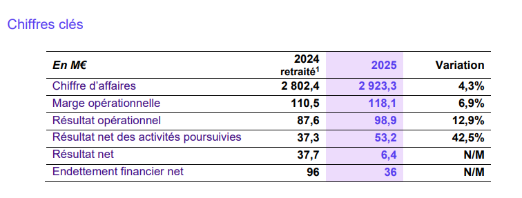 - Résultat des activités poursuivies de 53,2 millions d’euros, en forte augmentation (+42,5%1 vs 2024) grâce à l’amélioration de la performance opérationnelle.