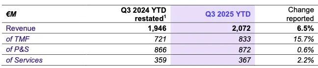 At the end of September 2025, Econocom posted year-to-date revenue of €2,072 million, up by 6.5% on a reported basis and 5.1% on an organic basis, compared to 2024 restated revenue on the same period. This performance reflects the Group’s sustained commercial momentum, supported by TMF activities, the resilience of our P&S activity and the contribution of our acquisitions.